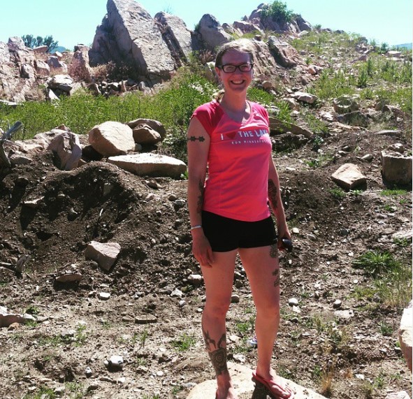 [image description: Author, smiling broadly standing on a rocky formation in the mountains of Utah]